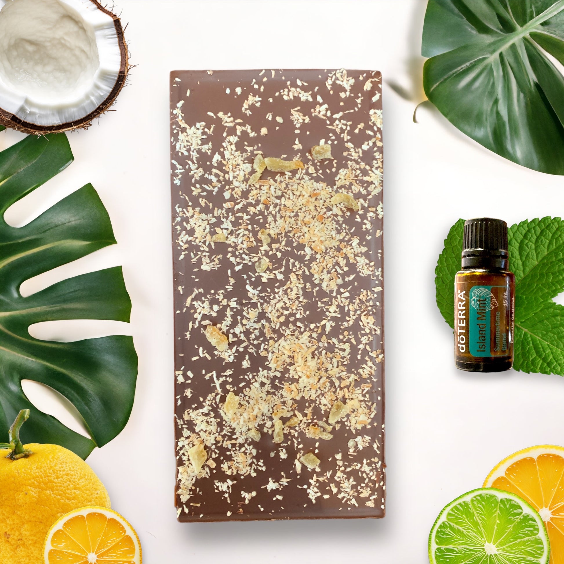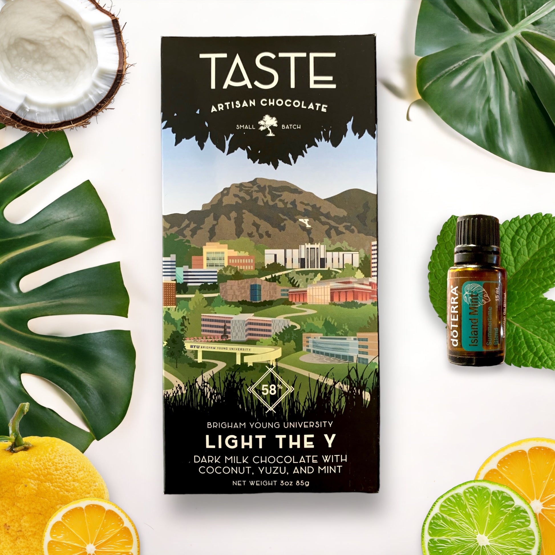 Introducing Light the Y – a unique and refreshing mix of dark milk chocolate, candied Yuzu peel, toasted coconut, and DoTerra Island Mint essential oil.