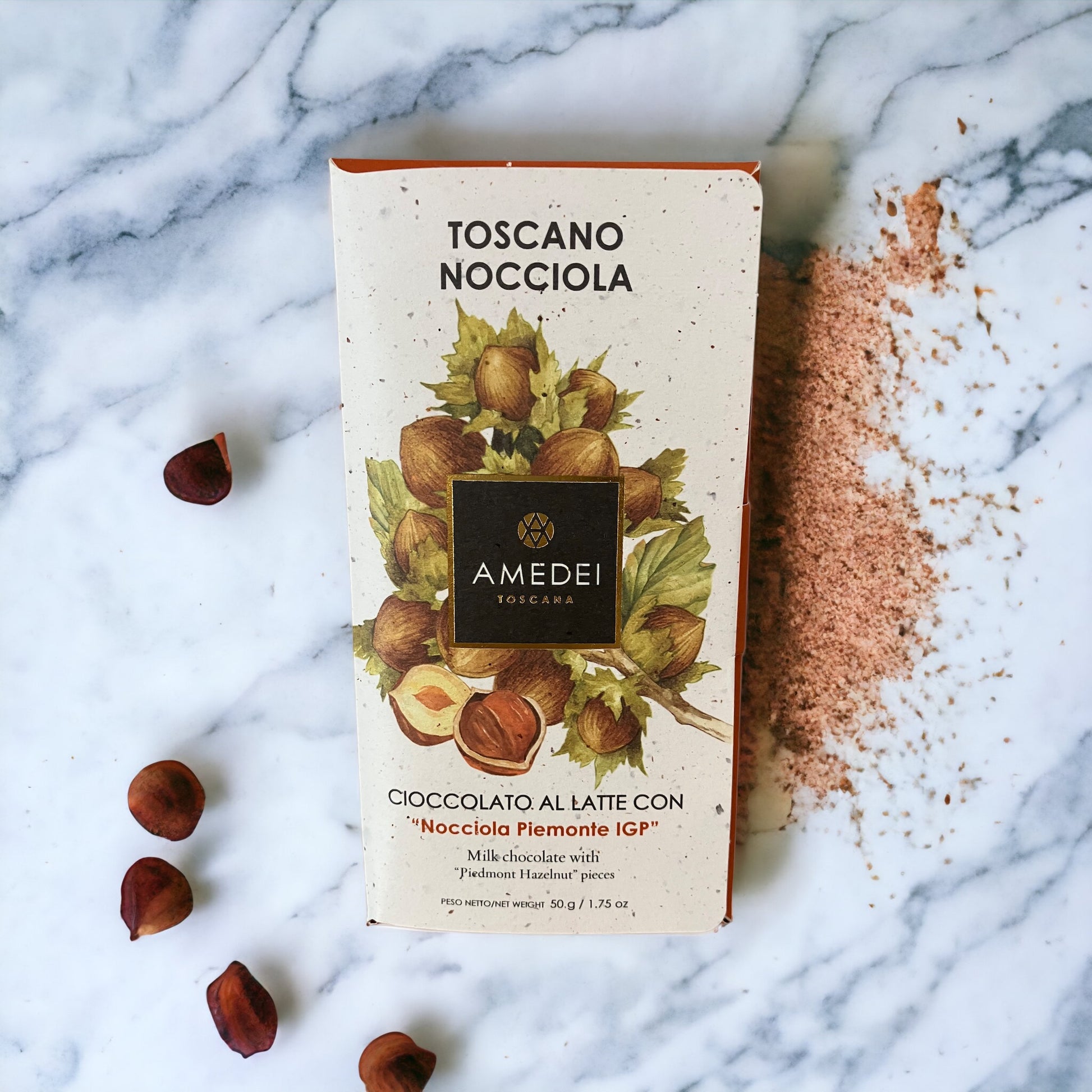 Amedei - Nocciole is a deliciously creamy Italian milk chocolate with a unique blend of sweet hazelnuts from Tuscany. Finest quality ingredients come together to create a chocolate that is sure to please with its smooth, milky texture and delightful notes.
