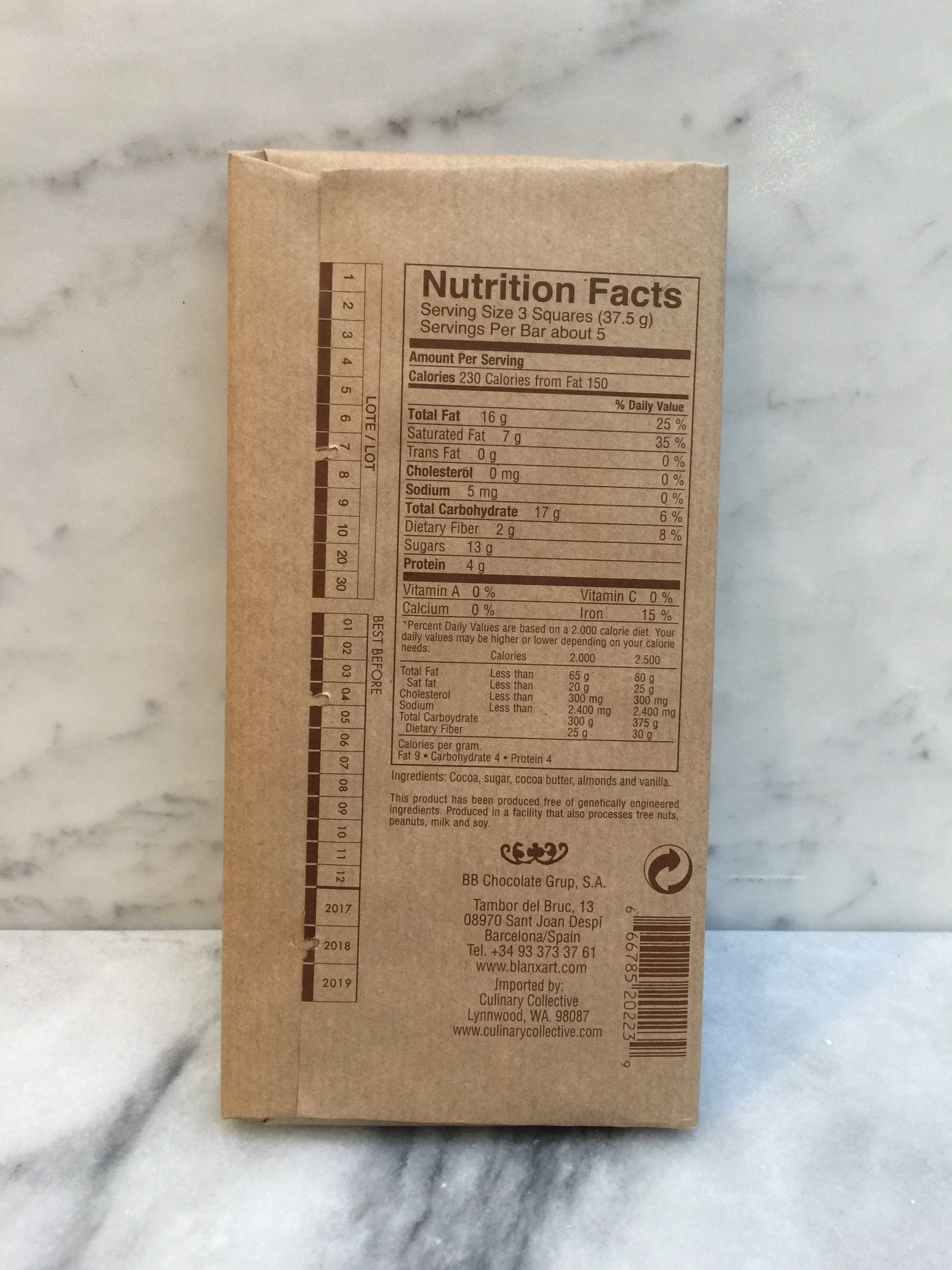 This gorgeous offering not only uses organic cacao, but also has a generous helping of Marcona Almonds embedded within! Never let it be said that Blanxart doesn't know how to treat their people right. Almonds, chocolate, and value, oh my!