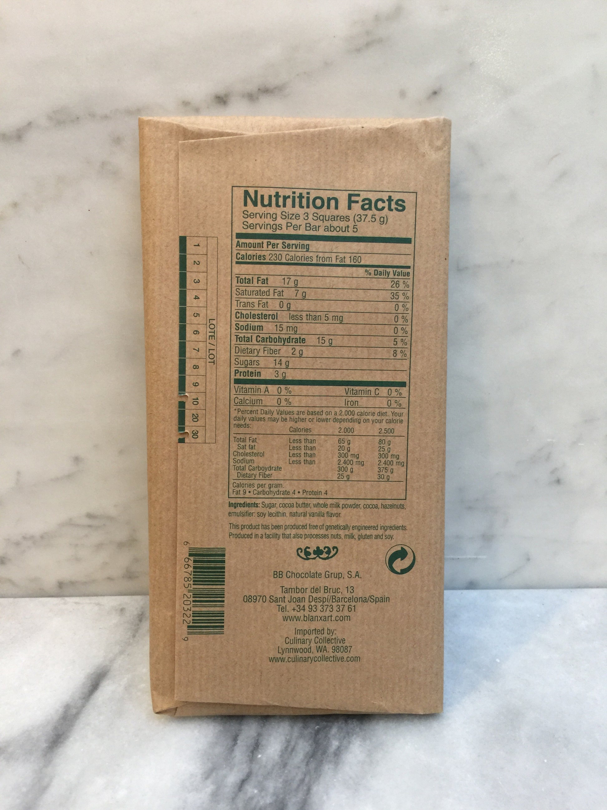 Hazelnuts, chocolate, and milk, a holy trinity of flavors and general sumptuousness. Blanxart's offering of this bar not only gives you nearly half a pound of delicious chocolate, but also gives you these three gorgeous flavors together again! A treat for the holidays, or indeed any day.