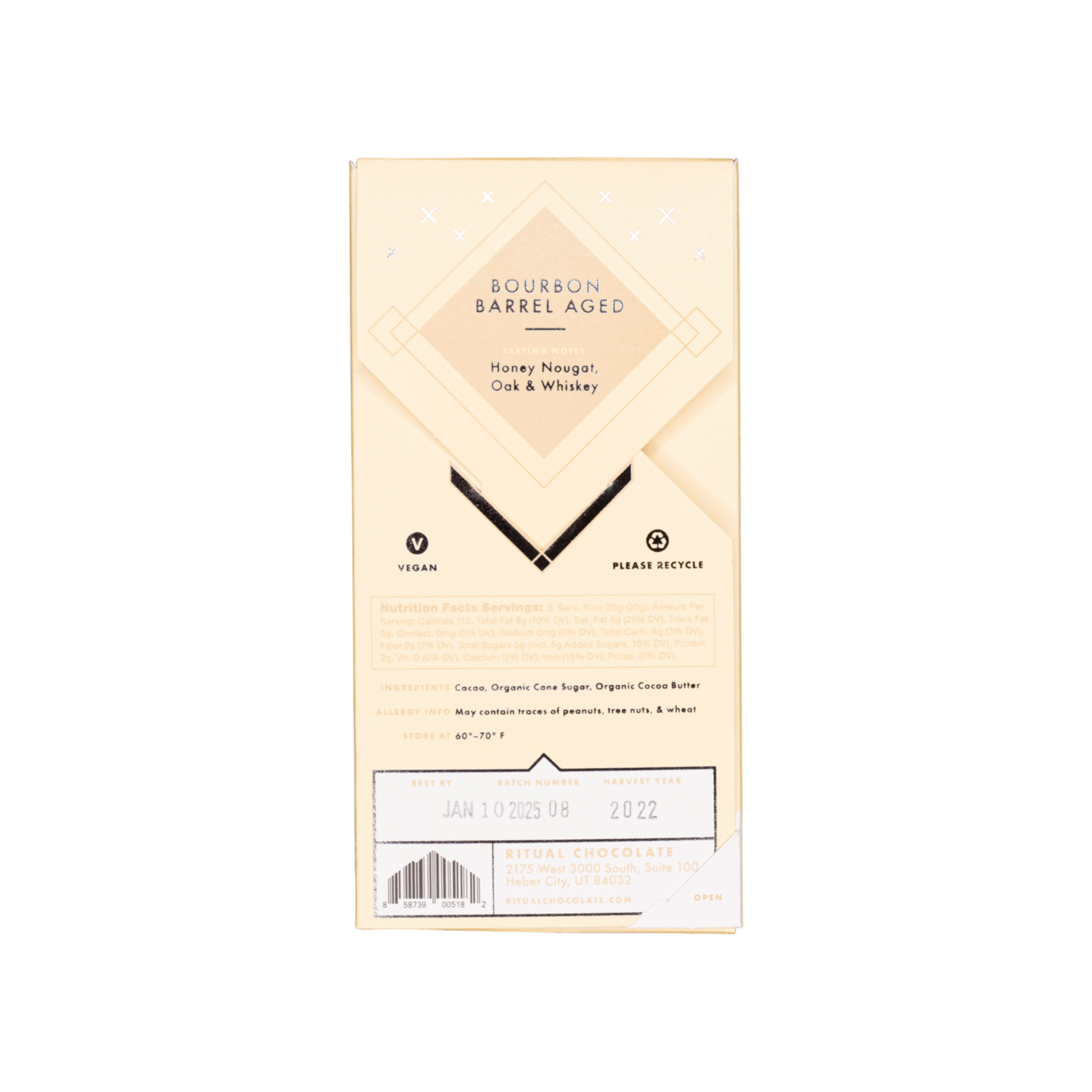 "This chocolate is made with a blend of our cacao nibs that are aged in High West Distillery bourbon whiskey barrels for several months. This process provides subtle notes of the charred, white American Oak and light hints of bourbon whiskey. We found that aging the nibs in a fresh whiskey barrel has an interesting effect on the final flavor of the chocolate. This is by no means a whiskey flavored chocolate, but the flavor of the whiskey is detectable. What really stands out is the "mellowing" effect of the oak whiskey barrel. The chocolate tastes a bit "softer around the edges" and has a pleasant aroma and aftertaste. Due to this unique aging process, this chocolate is extremely limited. High West is one of our local whiskey distilleries in Park City and is the go-to whiskey for those who want a little taste of the high mountain west.